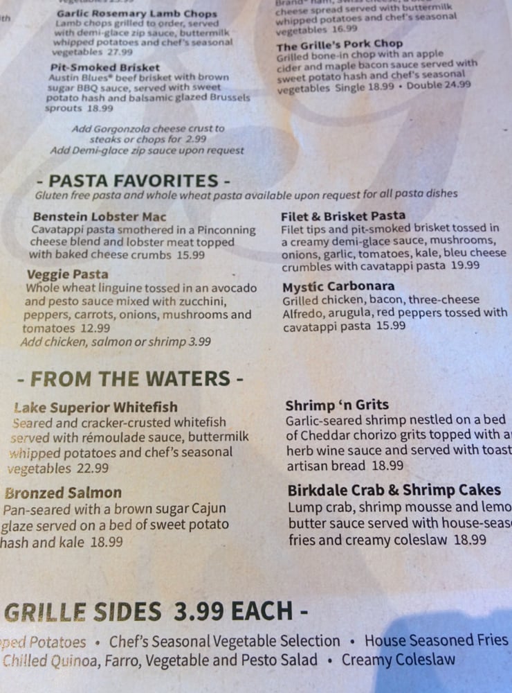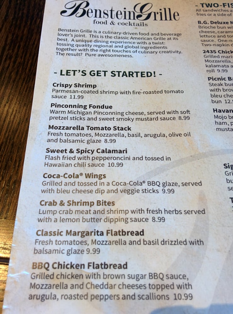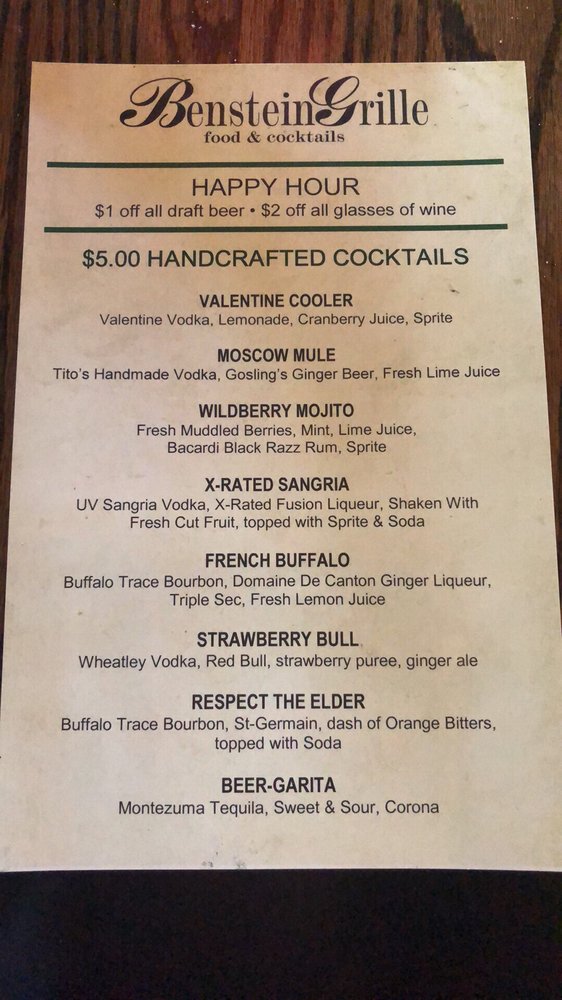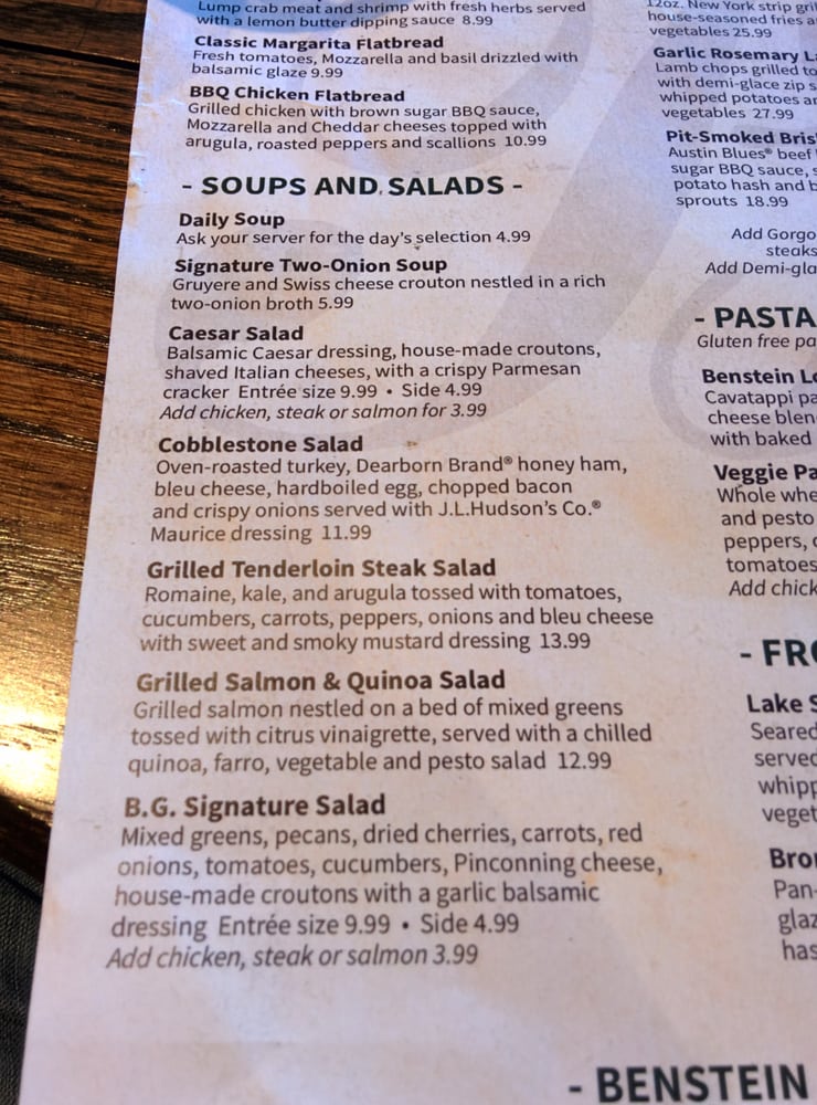 Benstein Grille is a New American restaurant located in Commerce Charter Township, MI. Offering a range of amenities such as outdoor seating, full bar, and wheelchair accessibility, it caters to various needs. The menu boasts dishes like Steak Bites, Pretzel Fondue, and Crab Rangoon for starters, Caesar Salad, and Grilled Tenderloin Steak Salad for soup and salads, and B.G. Deluxe 2 Napkin Burger and Wagyu Burger for sandwiches. Customers have praised the ambiance, service, and food quality, with highlights including the delicious bourbon selection, unique dishes like Signature 2Onions Soup, and the well-received entrees like pork chop and bronzed salmon. Overall, Benstein Grille offers a vibrant atmosphere and a diverse menu that caters to different tastes, drawing positive reviews from patrons.